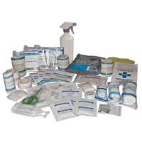 The standard FA required medical pack includes (approx): Cleansing wipes, Bandages (various), First Aid guidance leaflet, Foil blanket, Gause Swabs, Dressings, Face shield, Plasters, Safety Pins, Scissors, Spray bottle, Eye Pad. Storage bag and ice packs can be brought seperately.